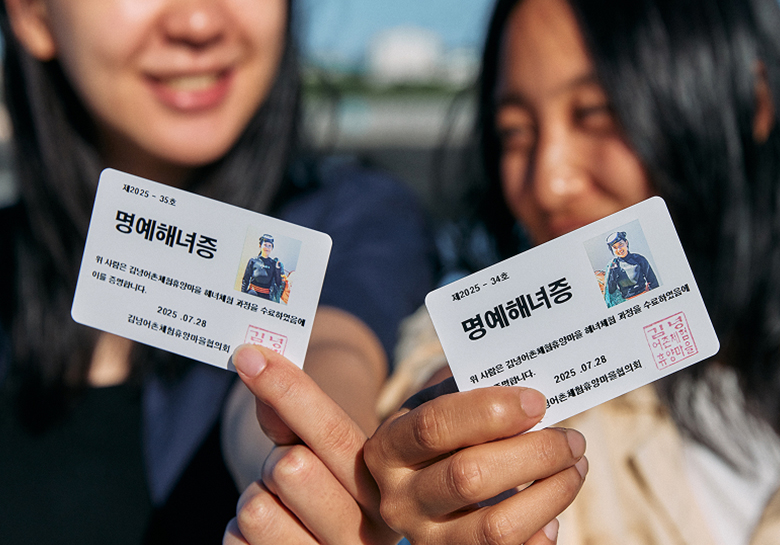 - 입교부터 훈련, 실습 그리고 마지막 수료식까지 이어지는 해녀훈련소의 여정. 모든 과정을 마치면 명예해녀증이 수여되고, 수료생만의 혜택과 오래도록 간직할 특별한 추억이 함께 남습니다.