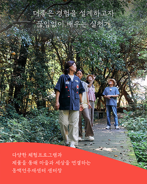 UNWTO(유엔세계관광기구)가 인증한 '세계 최우수관광마을' 동백마을에서 2013년부터 동백마을체험사무장으로 마을 일을 시작했고, 2025년부터 마을과 세상을 연결하는 동백언우재 센터장을 맡고 있는 최혜연입니다.