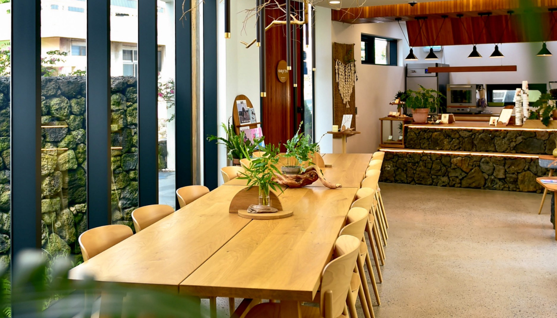 안녕하세요! 저희 부부는 제주도 서귀포시 하효동에서 오브제주라는 카페를 운영하고 있습니다. 서울에서 직장생활을 하다가, 남편의 고향인 제주도로 오면서, 오래된 건물이 있던 자리를 허물고, 지금의 ‘하효일오브제주’ 건물을 짓게 되었습니다. ‘하효일오브제주’ 건물은 독특한 외관으로 지나가는 이들의 시선을 사로잡습니다. 그래서인지 박물관이나 미술관 같다는 이야기를 종종 듣곤 하지요. 카페 내부로 들어오시면 제주의 오브제를 활용한 소품들과 초록을 더해주는 다양한 식물들로 꾸며진 모습을 보실 수 있습니다. 현직 디자이너인 남편이 직접 디자인하고 제작한 가구와 소품들로 꾸며진 이곳은 마치 작은 갤러리에 온 듯한 느낌을 줍니다. ‘일상이 예술이 되다’라는 표어처럼, 오브제주는 일상 속에서 예술을 경험할 수 있는 공간이라는 컨셉 아래 저희 부부의 취향이 자연스레 녹아있습니다. 크게 3개의 공간으로 나뉘는 실내공간은 각각의 공간이 가진 구조적 특징에 따라, 인테리어에 변화를 주어, 같은 카페 내부이지만, 마치 다른 공간을 이동하는 듯한 느낌을 받으실 수 있습니다. 그 중 현무암과 제주 바닷가에서 직접 채집한 유목을 소재로 만든 유니크한 오브제 제품들이 전시된 쇼룸은 카페 공간을 이용하시는 손님들께 또 다른 볼거리를 선사하고 있습니다.