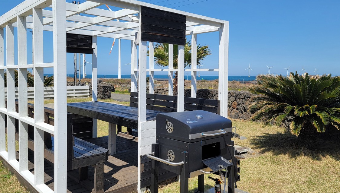 - 푸른 잔디에 펼쳐진 하얀 집과 푸르른 바다를 보며 즐기는 바비큐