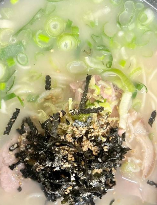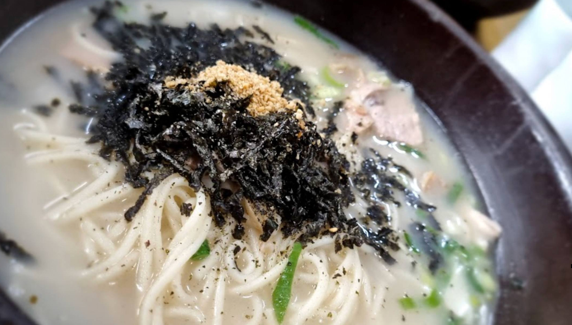 상큼한 귤이 들어간 김치로 만든 고기 국수