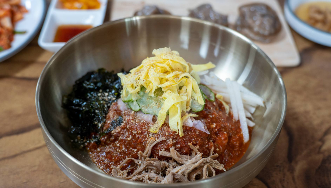 메밀면과 매콤, 새콤, 달콤양념이 담긴 비빔막국수