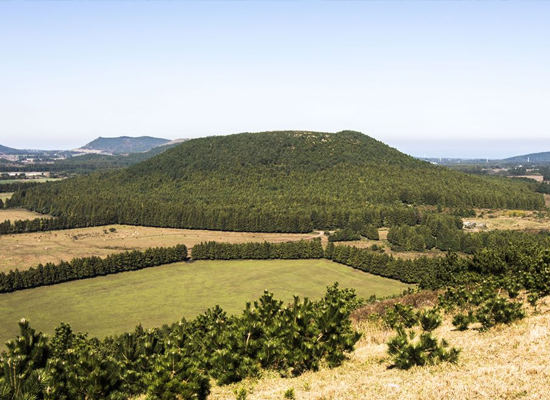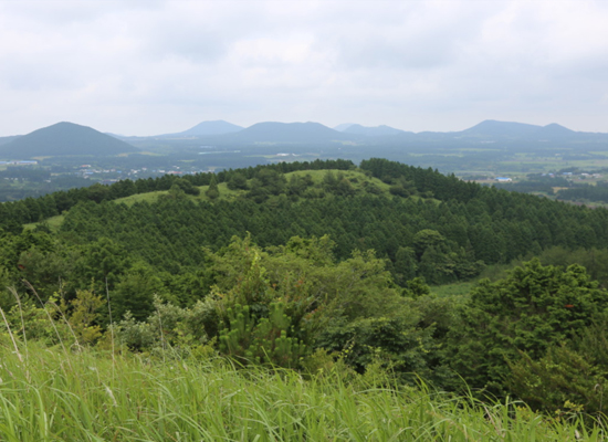 어머니가 아기를 안은 형체라 하여 불리는 모지 오름은 제주특별자치도 서귀포시 표선면 성읍리에 있는 기생화산입니다. 북동쪽으로 크게 벌어진 말굽형 화구 안에는 화구구(알오름-표고 268m, 비고 13m)가 솟아있으며, 이를 에워싼 등성마루는 마치 어린애를 안고 있는 어머니의 모습을 닮아 있습니다. 화구가 벌어진 동쪽 방향으로는 고분과 같이 보이는 작고 큰 봉우리가 구릉지대를 이루고 있으며, 그중 가장 높은 언덕을 오미 동산이라고 합니다. 오름 전 사면은 삼나무가 조립되어 중턱까지 숲을 이루고 있으며, 화구 안의 알오름과 정상부는 평평한 등성마루를 이루며 완만한 풀밭으로 이루어져 있습니다. 화구구(火口丘)는 분화구 안에서 새로 생겨난 단성의 이중화산활동의 여운으로서, 화구 중앙부에 뾰족한 봉우리의 형태로 소위 ‘알오름’이라고 합니다.