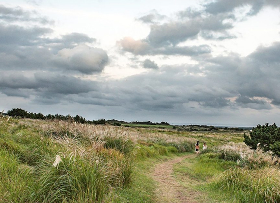 따라비오름에서 볼 수 있는 금빛으로 물든 바다를 감상하며 제주의 트레킹을 즐겨보세요!