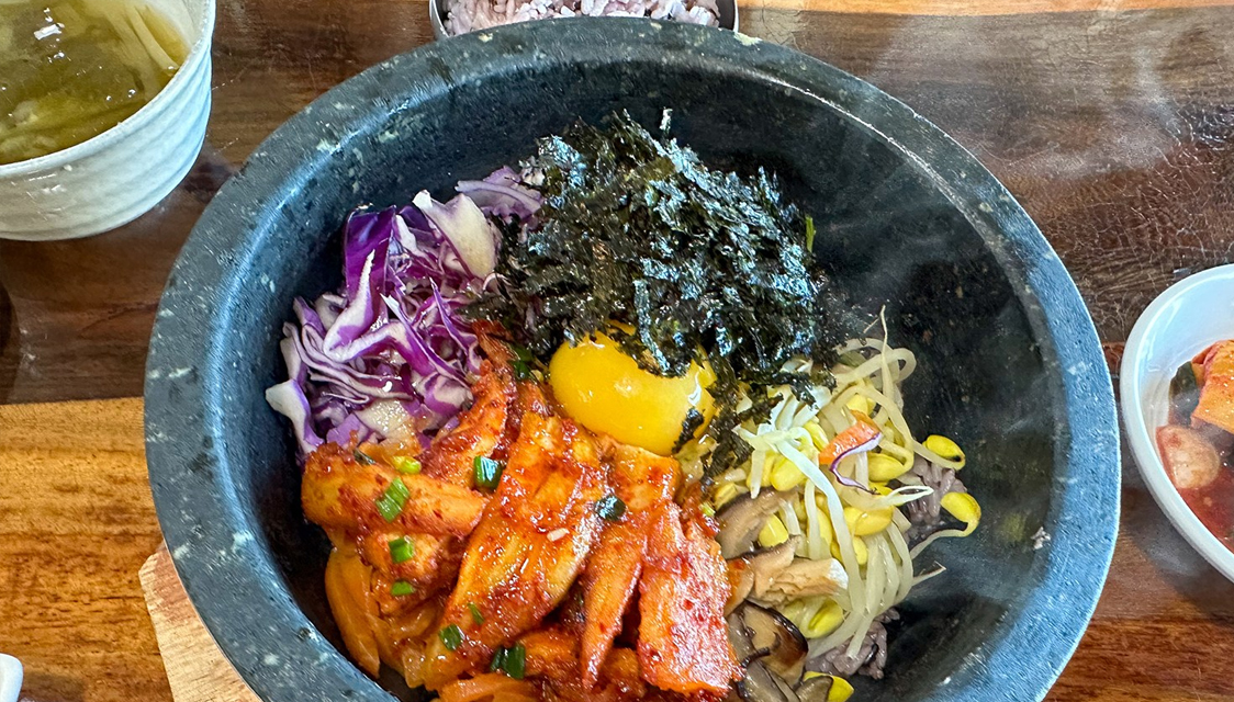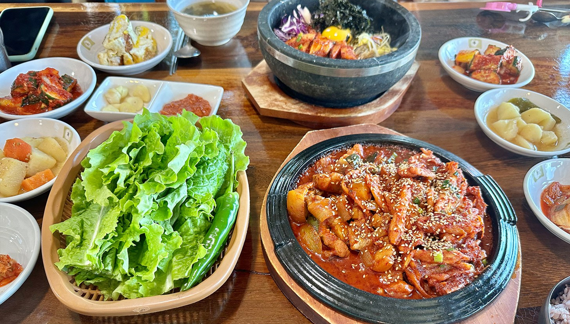 여러가지 국내산 야채와 제주산 더덕이 들어있는 더덕돌솥비빔밥