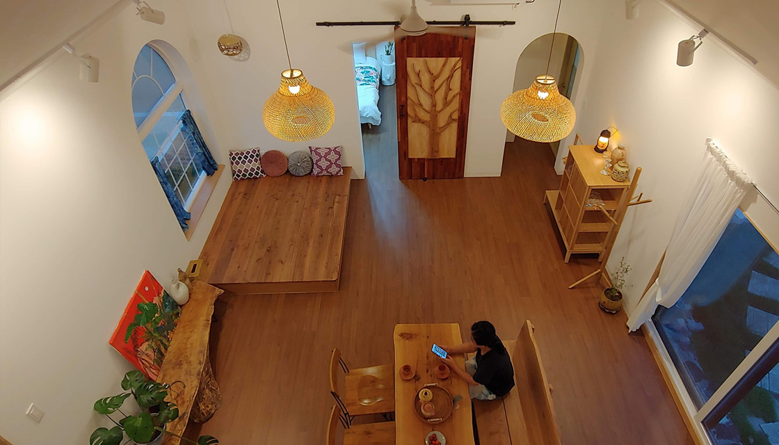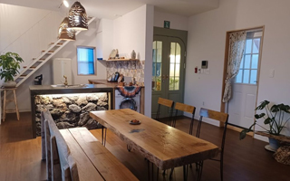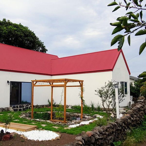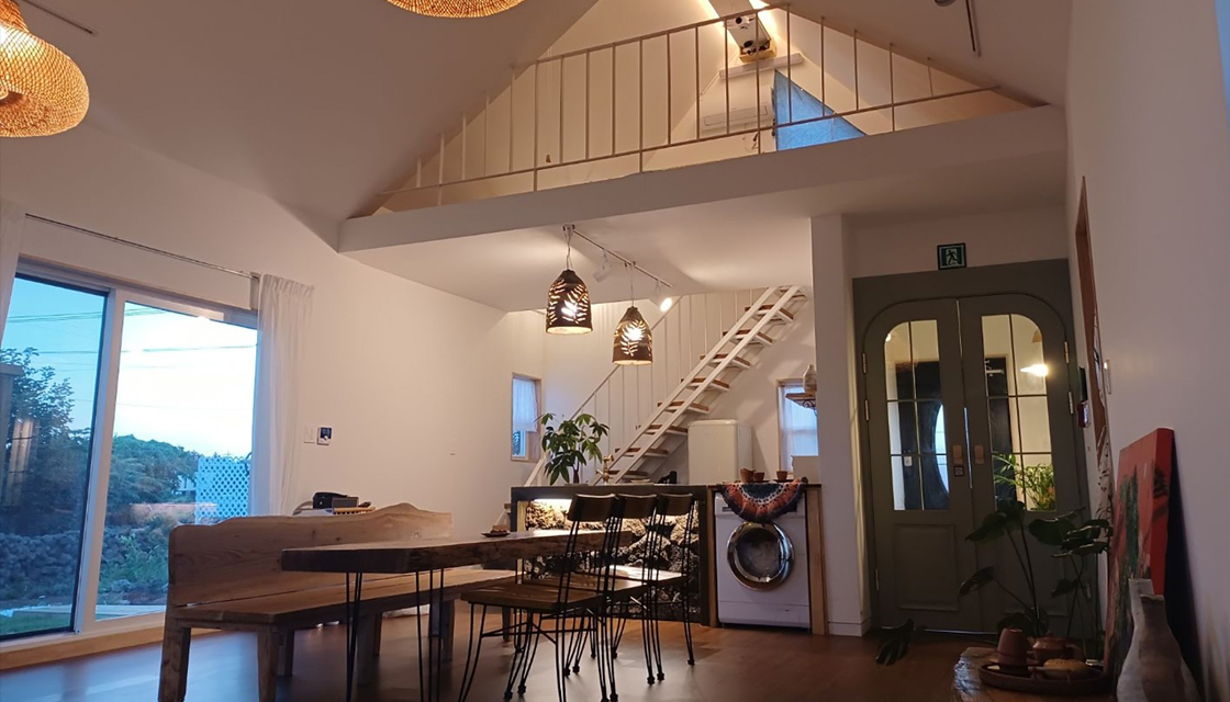 스테이 여정은 도자기 공예작가 부부가 디자인한 감성과 미적 디자인이 충만한 공간입니다. 가시리 동네의 독특한 느낌이 좋아, 반세기 넘게 자라온 고목인 후박나무 곁에 숙소를 짓게 되었습니다. 손수 만든 목공가구와 작품이 숙소 곳곳에 배치되어 있어요. 이국적이고 탁 트인 느낌을 주는 뾰족한 지붕, 돌담이 생각나는 아일랜드 식탁과 파고라. 제주의 정취를 물씬 느끼며 여행의 기분을 느껴보세요.